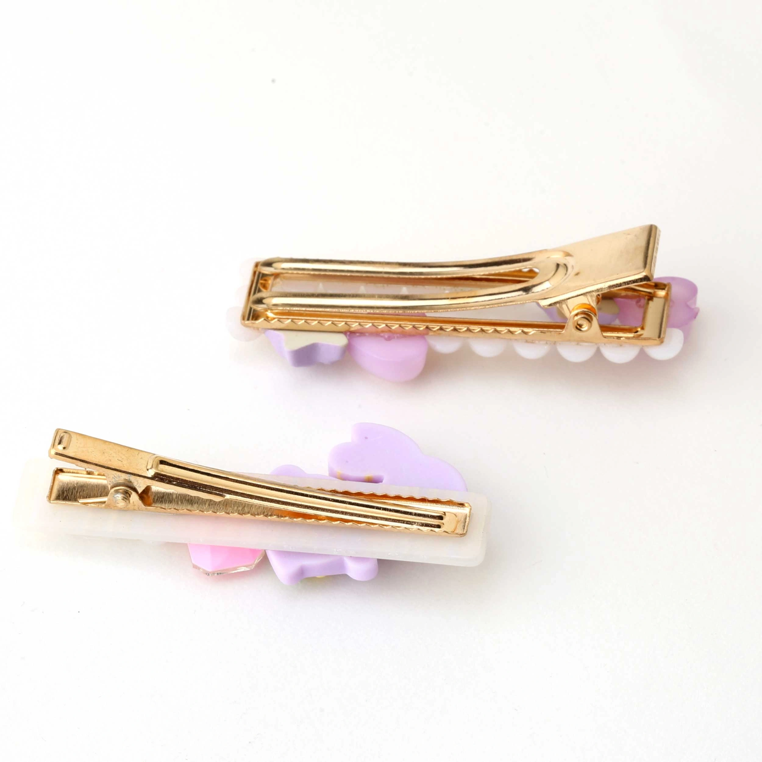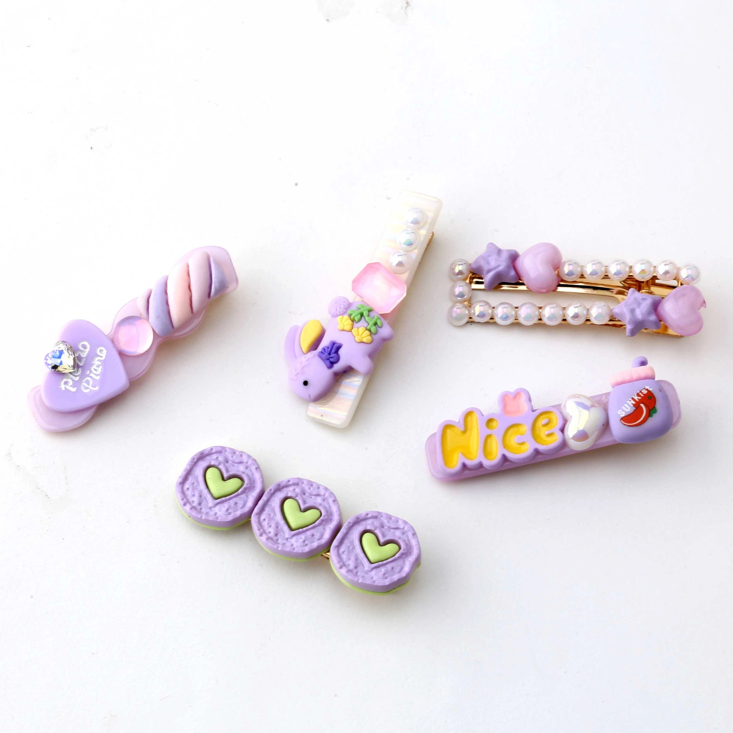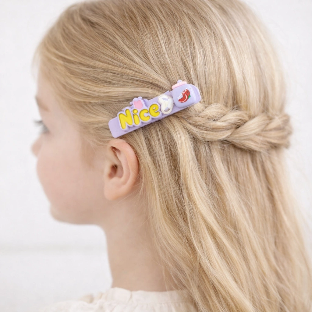 Mor renkli kız çocuk toka seti, kalp ve yıldız figürlü sevimli tasarımıyla saçlara eğlenceli bir dokunuş katar.